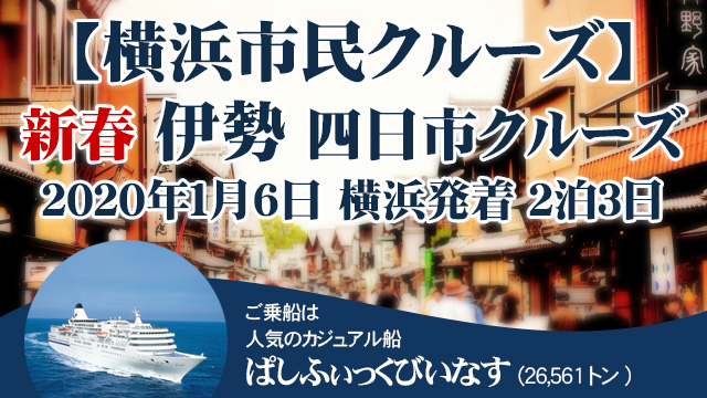ご旅行代金 69,360円より 当クルーズは横浜市が、横浜発着・伊勢/四日市3日間のクルーズを横浜市民向けの割引価格でご提供するものです。