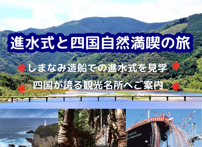 造船の町で船の誕生の瞬間に立ち会う進水式見学と、日本最大奇矯のかずら橋、清流四万十川など四国の名所を訪れる、添乗員同行で安心の自然満喫の旅です。